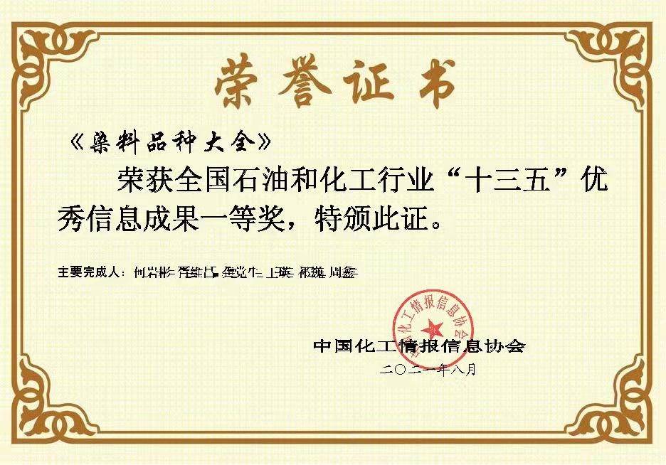 日前,全国石油和化工信息系统“十三五”经验成果评选结果正式公布。《染料与染色》期刊编辑部荣获“先进信息单位”称号;大型染料工具书《染料品种大全》荣获“优秀信息成果一等奖”;沈阳化工研究院院长,染料国家工程研究中心、中国化工协会染料专业委员会主任,全国染料工业信息中心负责人、《染料与染色》主编胥维昌荣获 “先进信息工作者”称号。